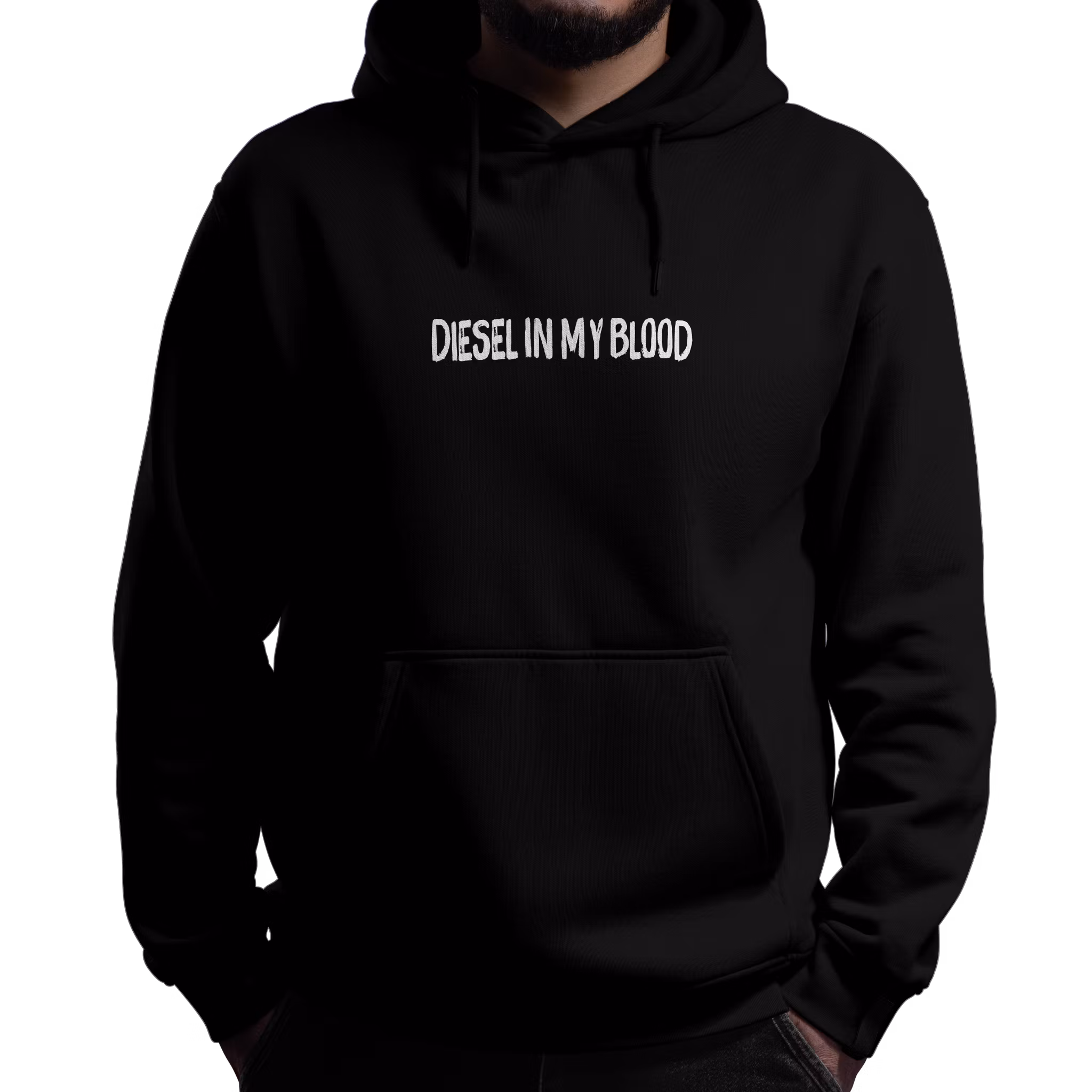 På bröstet sitter “Diesel In My Blood” – en rak markering för dig som lever med motorn som hjärtslag. På ryggen smäller budskapet ut i full storlek tillsammans med ett turkost motorhjärta – för vissa är det en slogan, för andra är det bokstavligt talat blodet som pumpar.