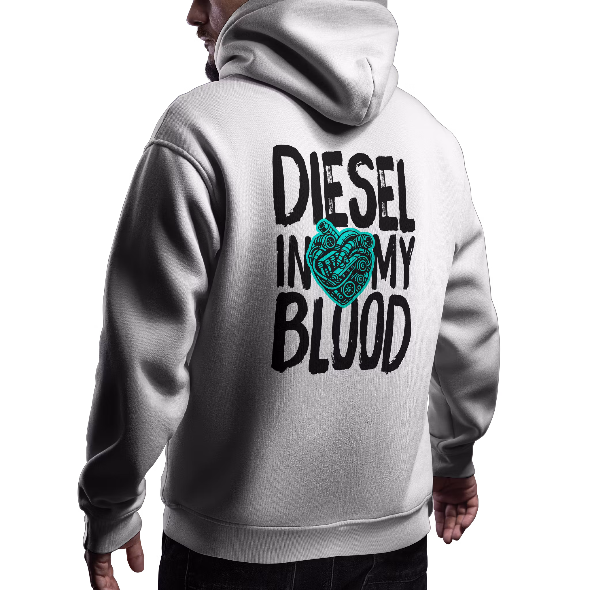 På bröstet sitter “Diesel In My Blood” – en rak markering för dig som lever med motorn som hjärtslag. På ryggen smäller budskapet ut i full storlek tillsammans med ett turkost motorhjärta – för vissa är det en slogan, för andra är det bokstavligt talat blodet som pumpar.