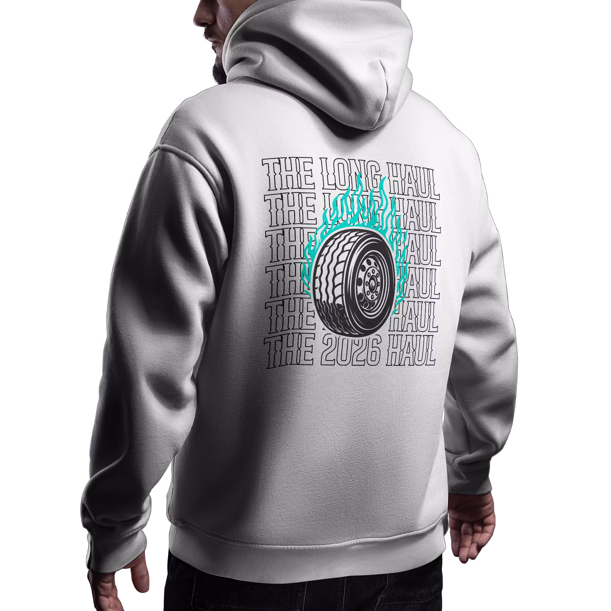 Liten HTD Truckshow logga på bröstet. Ryggtrycket bär årets tema “The Long Haul”. Ett motiv som representerar HTD Truckshow 2026.